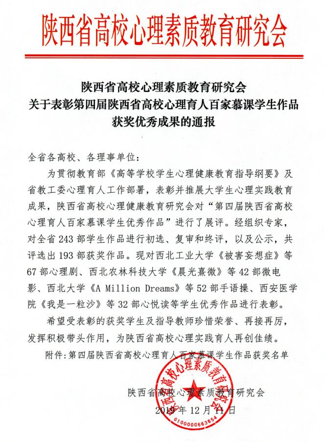 12月11日, 陕西省高校心理素质教育研究会发布《关于表彰第四届陕西省高校心理育人百家慕课学生作品获奖优秀成果的通报》我院参赛心理情景剧《蜕变》荣获三等奖。