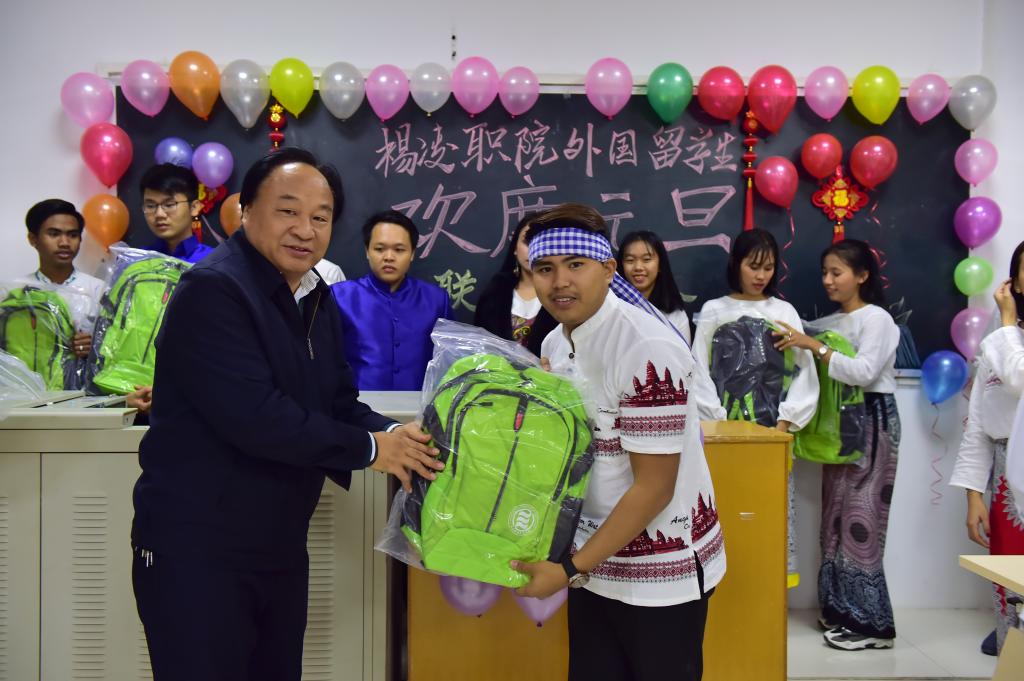 晚会开始前,王周锁首先代表学院向留学生们致以新年的问候和祝福希望留学生们在2020年继续努力学习,学业有所进步并为每位留学生赠送了书包作为新年礼物。