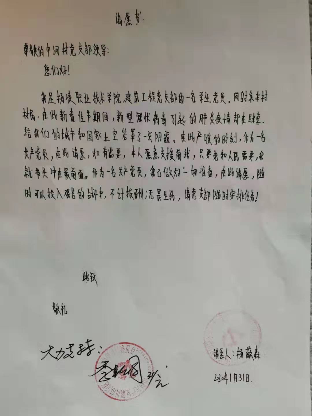“尊敬的申河村党支部领导:您们好!我是game365游戏中心建筑工程党支部的一名学生党员,同时系本村村民。在此新春佳节期间,新型冠状病毒引起的肺炎疫情却在肆虐,给我们的城市和国家上空笼罩了一层阴霾。在此严峻的时刻,作为一名共产党员,在此请愿,如有需要,本人愿意支援前线,只要党和人民需要,我就带头冲在最前面。作为一名共产党员,我已做好一切准备,在此请愿,随时可以投入艰苦的战斗中,不计报酬,无畏生死,请党支部随时安排任务!”