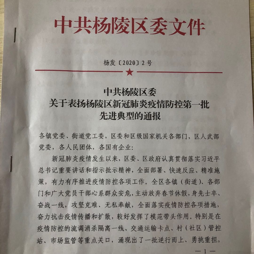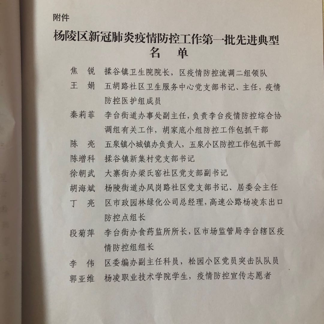 战“疫” 杨职在行动|我院学生郭亚维被评为杨陵区新冠肺炎疫情防控先进工作者