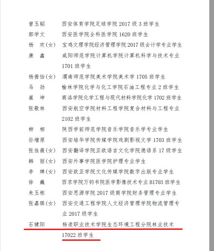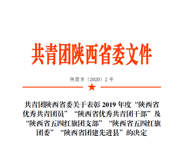 近日,共青团陕西省委公布了《青团陕西省委关于表彰2019年度“陕西省优秀共青团员”“陕西省优秀共青团干部”及“陕西省五四红旗团支部”“陕西省五四红旗团委”“陕西省团建先进县”的决定》陕团发【2020】2号,我院生态与环境工程分院学生石健阳荣获2019年度“陕西省优秀共青团员”称号。