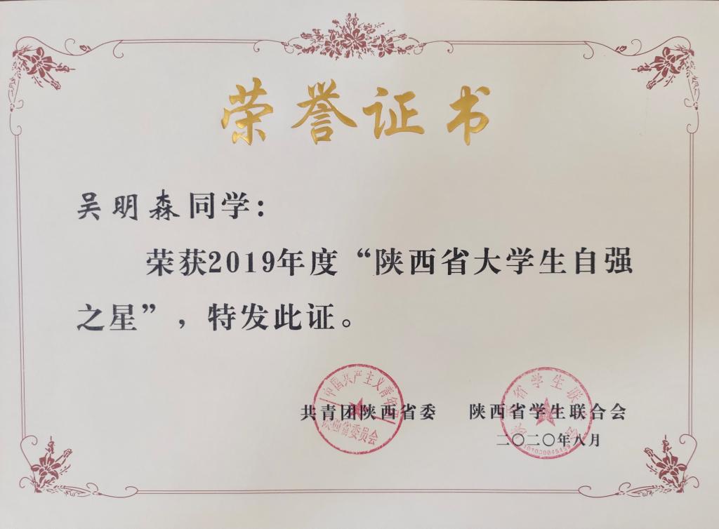 近日,团省委、省学联公布了2019年“陕西省大学生自强之星”获奖名单,我院水利工程分院党晓庆、生态环境工程分院吴明森两名学生荣获“陕西省大学生自强之星”荣誉称号。