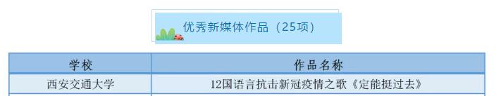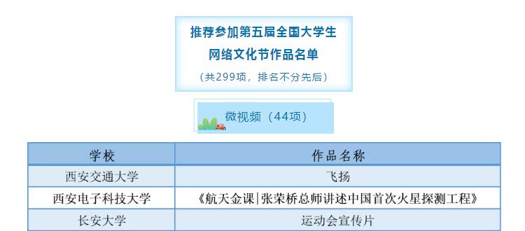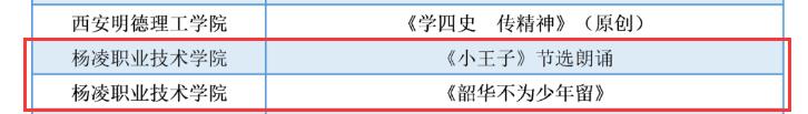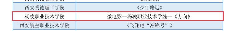 第五届“陕西高校大学生网络文化节”活动中,由党江薇、张春彦、杨义红等创作的《中国很赞》和由党江薇、郭欢欢、白雪阳创作的《习惯与改变》被评审为微视频类优秀作品,由李欲强、李可可、张明亮创作的《方向》被评审为微电影类优秀作品,由吴美娟创作的《烟雾缭绕不一定是天堂》被评审为公益广告类优秀作品,由张葭创作的《小王子节选朗诵》和张悦馨创作的《韶华不为少年留》被评审为音频类优秀作品,由党江薇创作的《梦想从这里起航》被评审为其他类网络创新作品优秀作品。