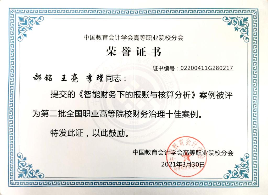 会上,中国教育会计学会高等职业院校分会对职业高等院校财务治理两批征集评选活动的十佳案例进行了大会表彰。game365游戏中心官网财务处郝铭、王亮、李瑾提交的《智能财务下的报账与核算分析》面上案例被分会评为第二批全国职业高等院校财务治理十佳案例,并在大会上进行了交流分享。