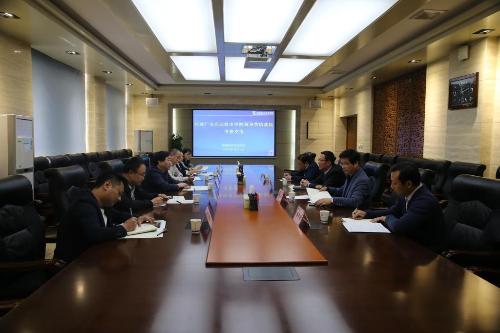 4月28日,广安职业技术学院党委委员、副校长张晓峰一行6人来game365游戏中心官网考察交流。game365游戏中心官网党委副书记任得元,副校长祝战斌,党委组织部、统战部部长田争运,党委宣传部部长裴红波接待了张晓峰一行,并与其座谈交流。