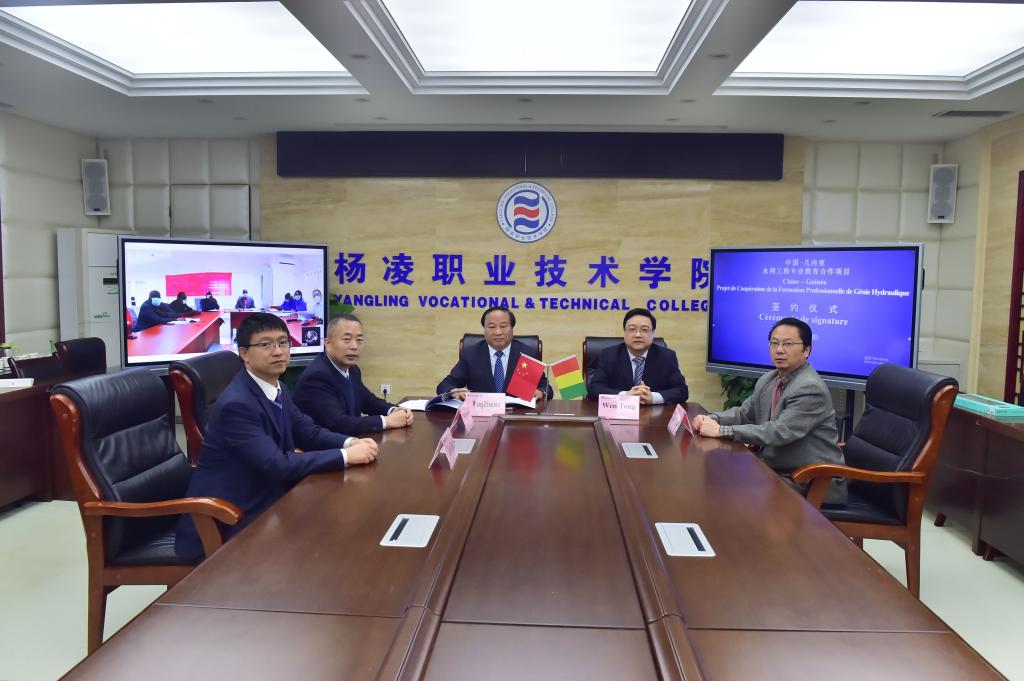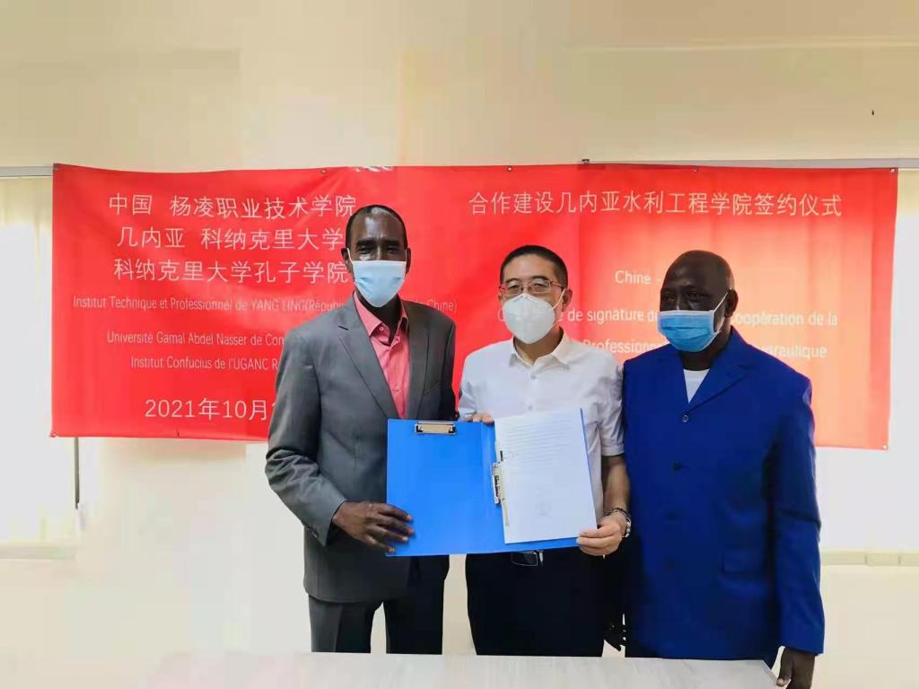 几内亚科纳克里大学校长特拉奥雷,国际合作处处长玛玛迪,理工学院副院长朗塞尼教授,土木工程系主任、水利工程学院负责人莫里博士,科纳克里大学孔子学院中方院长王宝祥、几内亚方院长米歇尔教授,水利工程学院项目负责人刘鑫杰,中文教师代表古龙;陕西省教育厅外事处处长文通,杨凌职院校长王周锁、副校长胡俊鹏、国际学院院长杜斌、水利工程学院副院长郭旭新等参加了签约仪式。签约仪式由王宝祥主持。