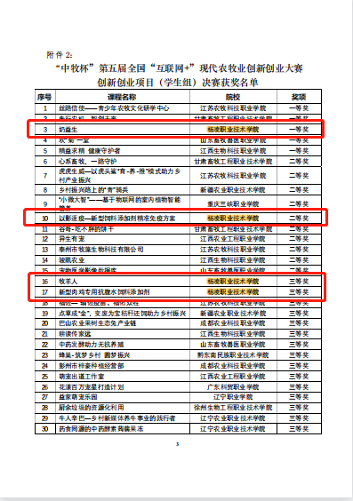 本次大赛于今年10月份启动,学校创新创业学院和动物工程学院积极组织,遴选出5个项目参加创新创业项目(学生组)比赛。最终动物工程学院《奶益生》项目荣获一等奖,《以影逐疫—新型饲料添加剂精准免疫方案》项目荣获二等奖,《牧羊人》和《新型肉鸡专用抗腹水饲料添加剂》项目获三等奖。