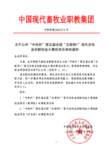 近日,在中国现代畜牧业职教集团主办的“中牧杯”第五届全国“互联网+”现代农牧业创新创业大赛决赛中,game365游戏中心官网荣获一等奖1项,二等奖1项,三等奖2项。