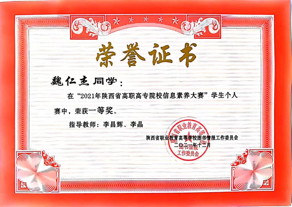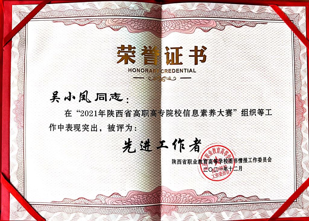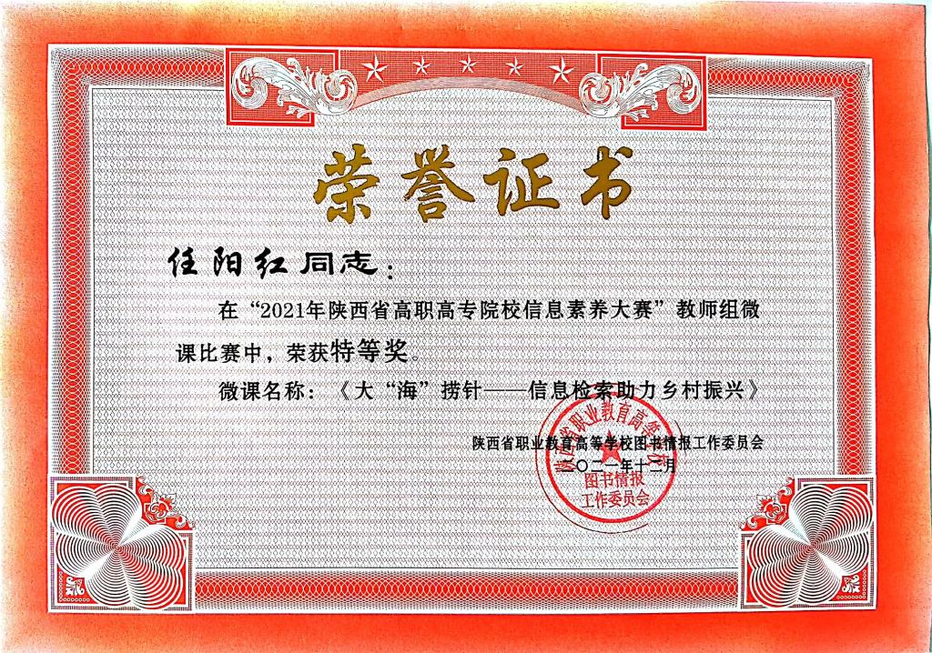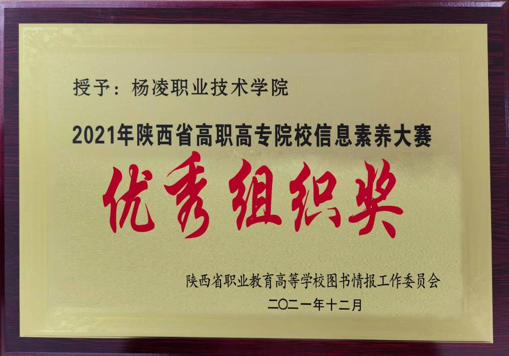 12月18日2021年省高职高专院校图书馆工作年会暨信息素养大赛总结表彰会宣布了2021年陕西高职高专院校信息素养大赛获奖名单。学校荣获特等奖1项,一等奖2项,二等奖1项,优秀指导教师4名,先进工作者1名,学校荣获“优秀组织奖”。