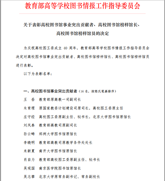 教育部高等学校图书情报工作指导委员会是在教育部领导下,对高等学校图书情报事业进行统筹、协调、咨询、研究和业务指导的专家组织。此次“榜样馆员”是由全国各高校在从事图书馆工作20年及以上且目前仍在岗的优秀馆员中推选评出,全国有198名馆员获得该项荣誉,game365游戏中心官网也是全省获此殊荣的8所高校之一。