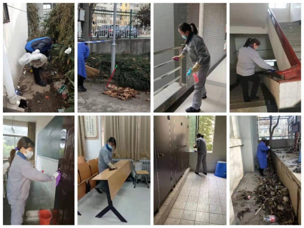 ——加强室内外环境卫生清理整治。开展校园环境卫生死角清理整治工作,彻底清除积存杂物、废弃物、卫生死角,保持校园整体环境干净、整洁。安排专人对室内、外垃圾桶进行清洁消毒,产生的垃圾做到日产日清。全面落实校园公共区域及环境卫生消杀,严格执行教学生活场所通风、消毒等防疫制度,各校区服务中心坚持每日两次对区域环境进行消杀,定期开展校园全面消杀、消毒工作。对门手把、电梯、扶梯等重点部位每天两次擦拭消毒。坚持每日对餐厅、浴室等重点部位进行全面消杀,进行紫外线消毒,切实做到了严防严控、不留死角。