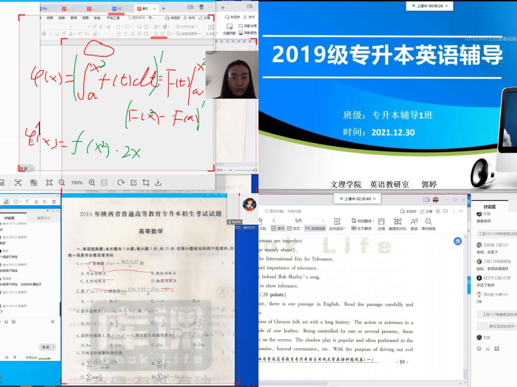 ——线上线下同步开展辅导。文理学院按照“整体线上,个别线下”的原则开展辅导工作。16名辅导教师通过腾讯课堂”等平台4个辅导班分别围绕“专升本”考试大纲,重点辅导讲解历年考试真题和模拟套题同时,根据学生学习过程中难理解、难掌握的知识点和重点学生,有针对性地进行线下个别辅导答疑。
