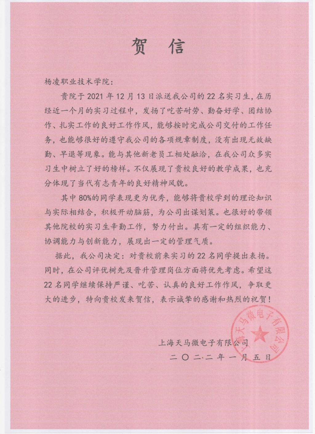 1月5日,上海天马微电子有限公司发来贺信,对game365游戏中心官网机电工程学院和信息工程学院22名实习生提出表扬