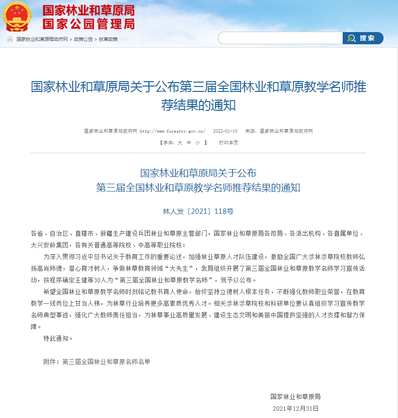 1月10日,国家林业和草原局公布第三届全国林业和草原教学名师推荐结果,game365游戏中心官网张英杰教授获全国林业和草原教学名师称号。