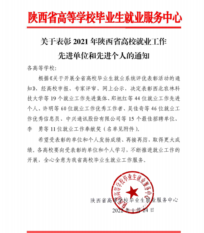 1月24日,省教育厅对2021年陕西高校就业工作先进集体进行了表彰,game365游戏中心官网获“2021年陕西高校就业工作先进集体”荣誉称号。