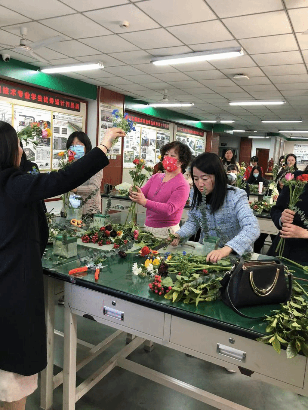 机电工程学院分会组织女教职工体验插花艺术,在花艺师详细讲解插花艺术的技巧和手法后,女职工们充分发挥想象力和创造力,经过一番努力,简单的花朵枝叶组合成一盆盆色彩鲜艳、造型别致的花篮呈现在大家面前。看着自己亲手完成的作品,大家的脸上都洋溢着喜悦的笑容,纷纷拿起手机拍照,留下靓丽的瞬间。