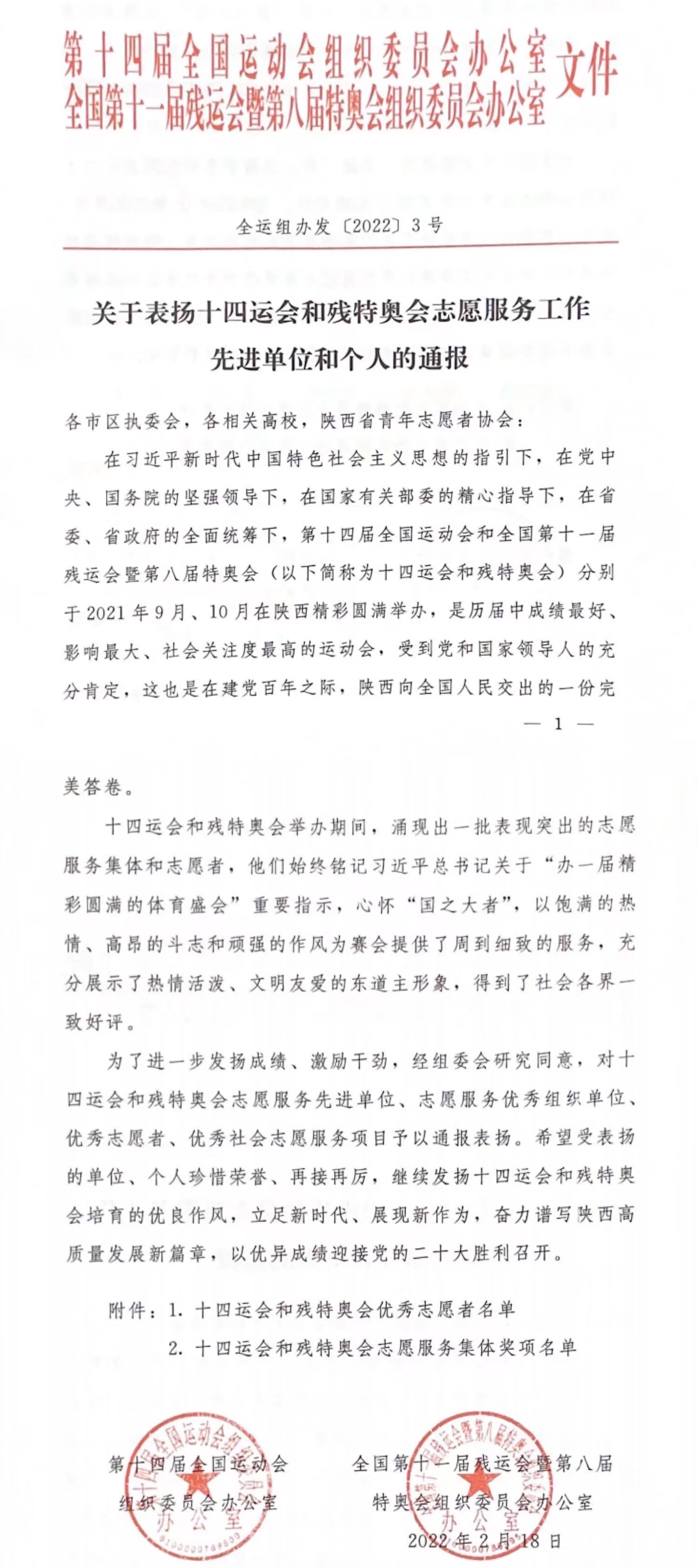 2021年9月,第十四届全国运动会面启动以来,game365游戏中心官网260名团员青年志愿服务十四运会和残特奥会赛艇、皮划艇(静水)项目,积极参与火炬传递活动(杨凌示范区站),以饱满的热情、专业的服务圆满完成了赛事期间各项志愿服务工作,赢得了组委会、参赛运动员和裁判员的一致好评,展现了当代大学生蓬勃向上的精神风貌和无私奉献的志愿精神。经组委会研究同意,予以通报表扬。