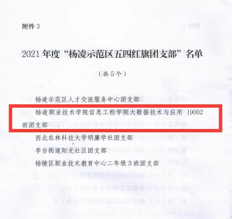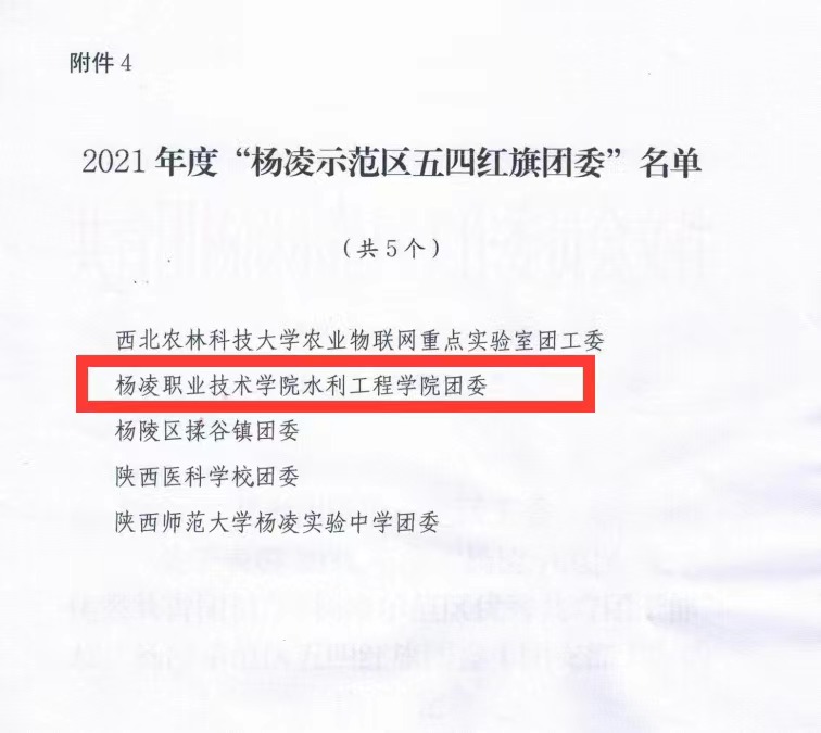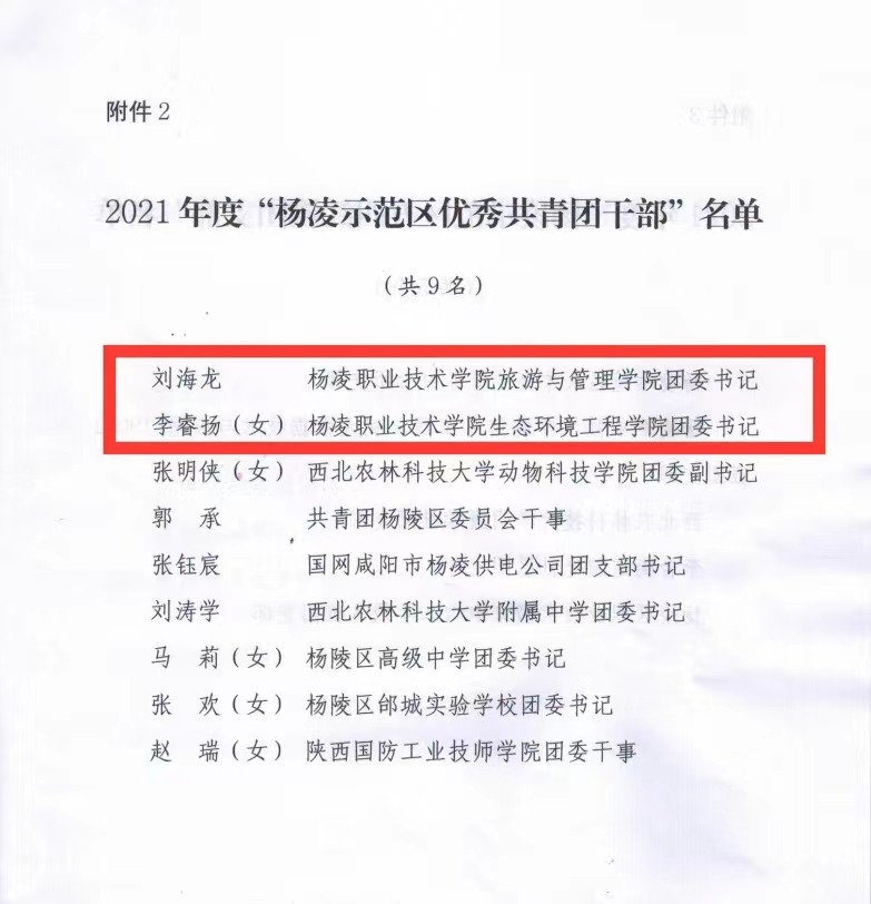 4月29日,杨凌示范区召开“两红两优”表彰暨优秀青年代表座谈会。学校水利工程学院分团委获2021年度“杨凌示范区五四红旗团委”荣誉称号,信息工程学院大数据技术与应用19002班团支部获2021年度“杨凌示范区五四红旗团支部”荣誉称号,教师团干部刘海龙、李睿扬获2021年度“杨凌示范区优秀共青团干部”荣誉称号。