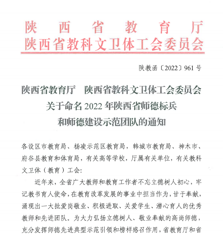 近日,陕西省教育厅、陕西省教科文卫体工会委员会联合发文,公布2022年陕西省师德标兵、师德建设示范团队、黄大年式教师团队和陕西省教育世家名单。game365游戏中心官网水利工程学院赵英老师获评陕西省师德标兵,生物工程学院被命名为陕西省师德建设示范团队,动物工程学院畜牧兽医教师团队入选陕西省高校黄大年式教师团队,药物与化工学院刘玉凤家庭获陕西省教育世家荣誉称号。