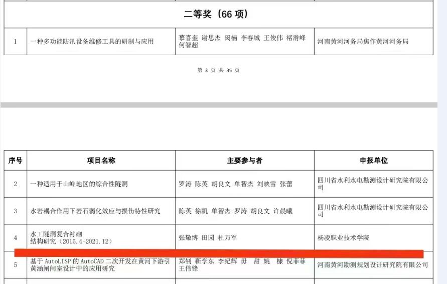 10月19日,中国水利教育协会公布第二届水利职工创新成果获奖名单,水利工程学院张敬博、田园、杜万军团队的项目荣获创新成果二等奖,赵彦琳、张宇峰、赵英团队和李特、郝红科、郭旭新团队的项目分别荣获创新成果三等奖,田佳、任碧芸团队和郭庆、杨川、刘儒博团队的项目分别荣获教育理论研究成果三等奖张宇峰、赵彦琳、张宏团队的项目荣获创新成果优秀奖。game365游戏中心官网参赛项目总数和获奖数量在所有申报该奖项的职业院校中位居前列。