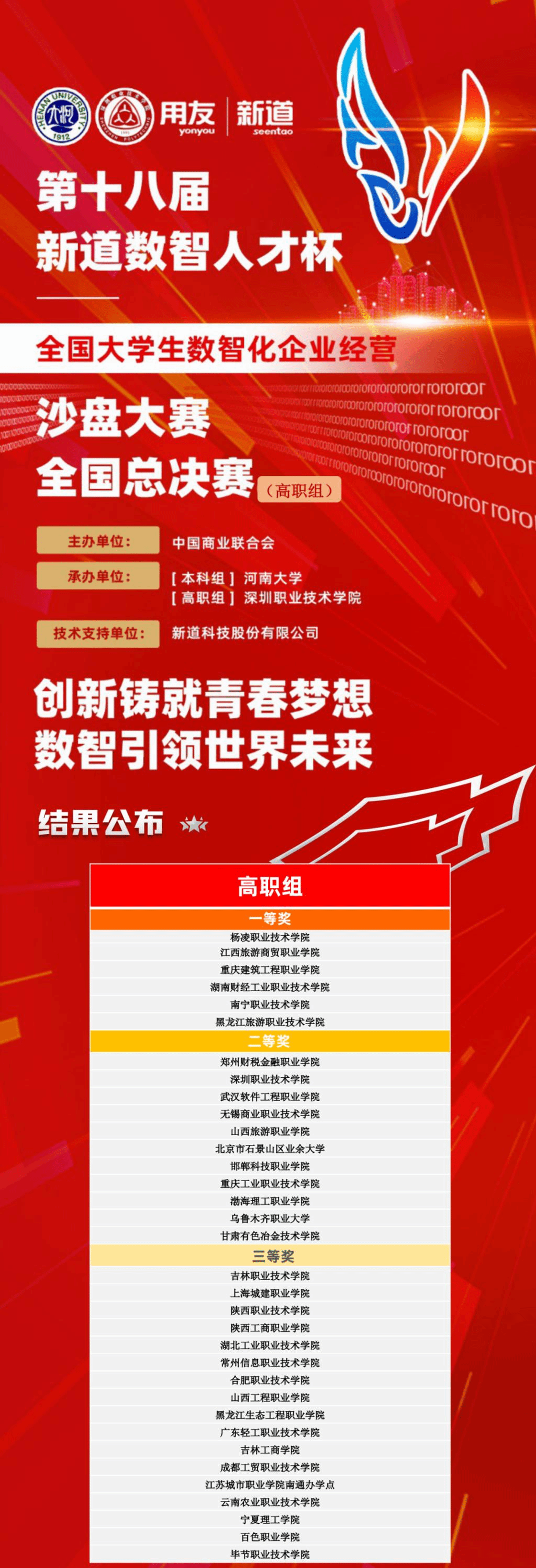 11月12日,第十八届“新道数智人才杯”全国大学生数智化企业经营沙盘大赛全国总决赛(高职组)圆满结束,经过一天的激烈的角逐,game365游戏中心官网经济与贸易学院学生王家乐、刘虹池鲁文杰冯迎亮组成的参赛队以第一名的优异成绩荣获全国总决赛一等奖,这是game365游戏中心官网在此赛项上取得的历史最好成绩。