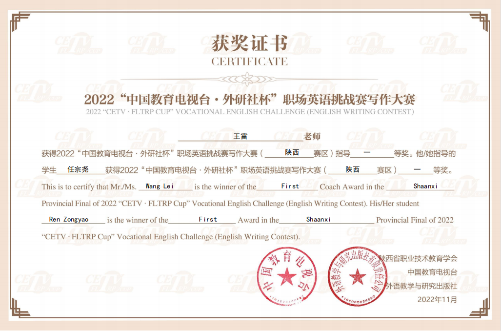 学校获职场英语挑战赛陕西赛区写作比赛特等奖