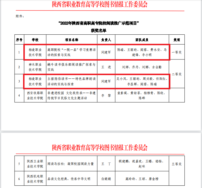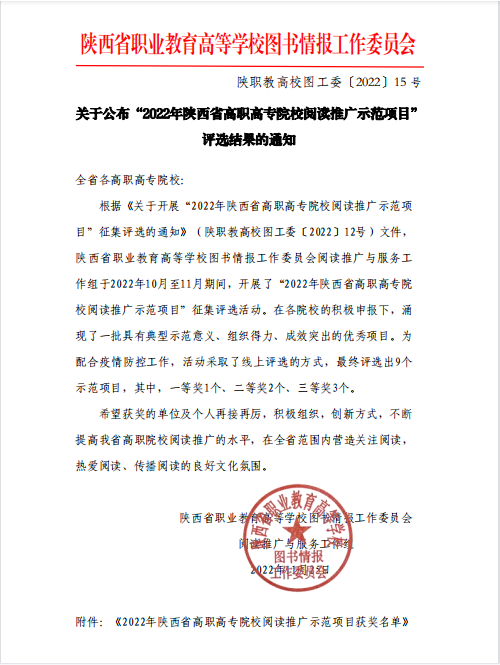 近日,陕西省职业教育高等学校图书情报工作委员会公布了“2022年陕西省高职高专院校阅读推广示范项目”评选结果。game365游戏中心官网申报的“高职院校‘一院一品’学习竞赛活动的探索与实践”、“主播陪你读书——特色品牌朗读活动的实践与探索”项目分别获一等奖、二等奖。
