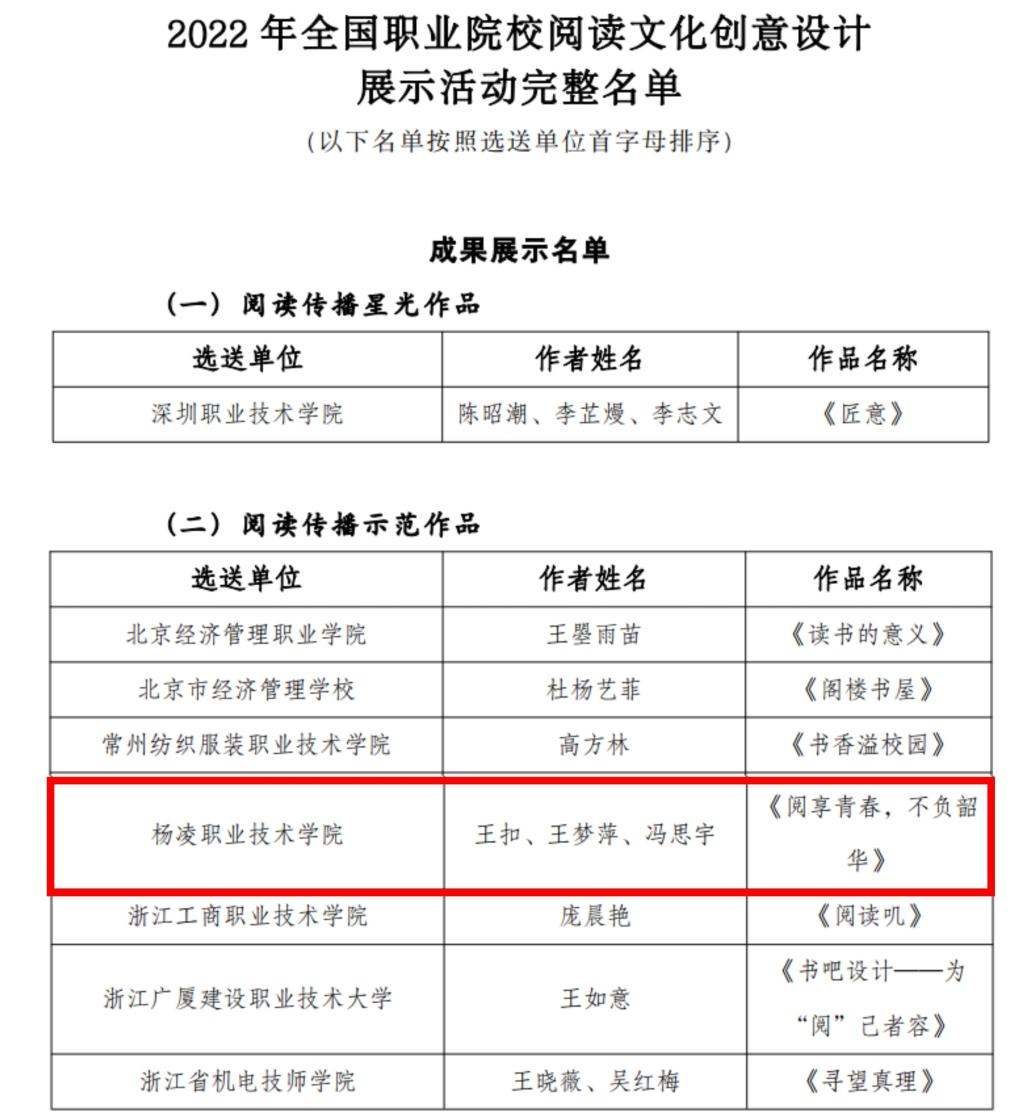 此次活动由教育部职业院校文化素质教育指导委员会、教育部职业院校艺术设计类专业教学指导委员会联合主办,以“书香溢校园,阅读赋智慧”为主题,共吸引了618所院校参与,通过审核作品9556件。经单位推选、专家网络初评、专家总评研议等环节,共评选出301件作品进入“成果展示名单”,包括阅读传播星光作品1件、阅读传播示范作品20件、阅读传播优秀作品60件及阅读传播创意作品220件。