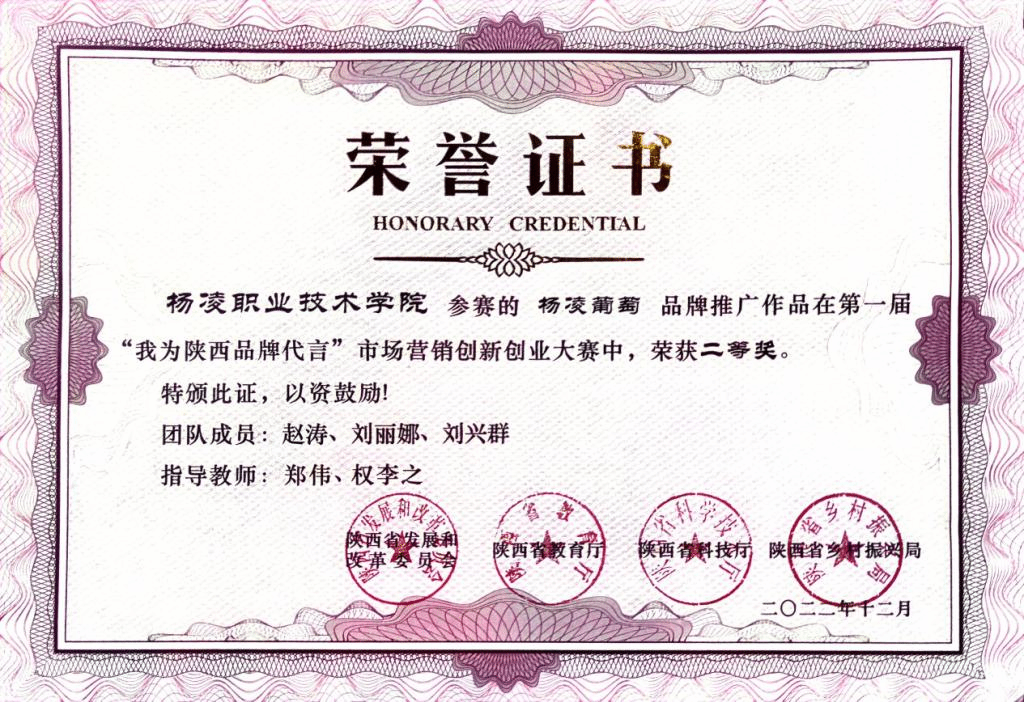 本次比赛主题为“推广农业品牌,助力乡村振兴”,由省发展和改革委员会主办,品牌和高质量发展研究中心、西安理工大学联合承办,省委宣传部、省教育厅、省科技厅、省农业农村厅、省乡村振兴局等多部门指导。共有来自全省30余所高校的300支队伍、3000名学生参加。game365游戏中心官网“秦拾味”团队以杨凌葡萄为选题,从5月至10月历经2个阶段赛事活动,最终取得二等奖第1名的好成绩,也是陕西高职院校中最高获奖学校。