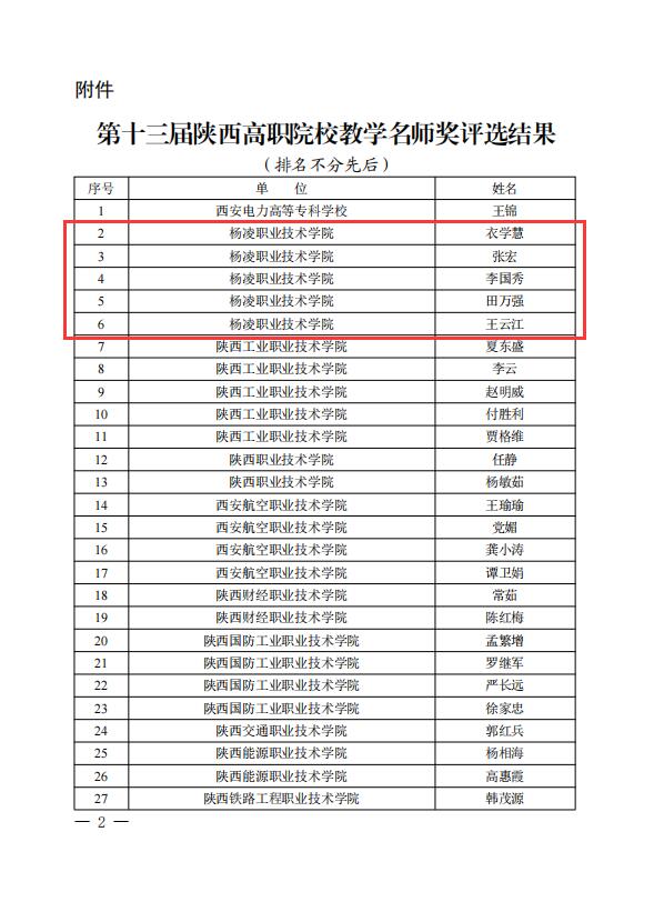 近日,省教育厅公布关于表彰第十三届陕西高职院校教学名师奖获奖教师的通知,game365游戏中心官网衣学慧、张宏、李国秀、田万强、王云江5位教授获评第十三届陕西高职院校教学名师奖。