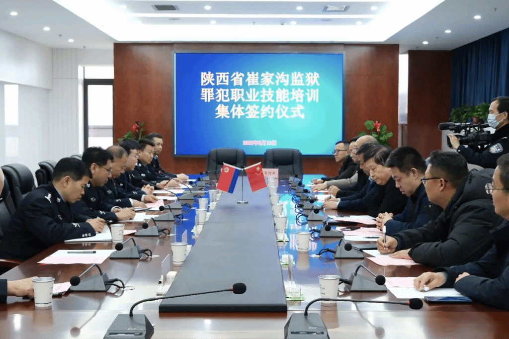 2月12日下午,学校与陕西省崔家沟监狱罪犯职业技能培训集体签约仪式在崔家沟监狱指挥大楼举行。副校长祝战斌、生物工程分院副院长杨振华、崔家沟监狱政委宋晓鹏、副政委王云峰、副监狱长张建瑞出席签约仪式
