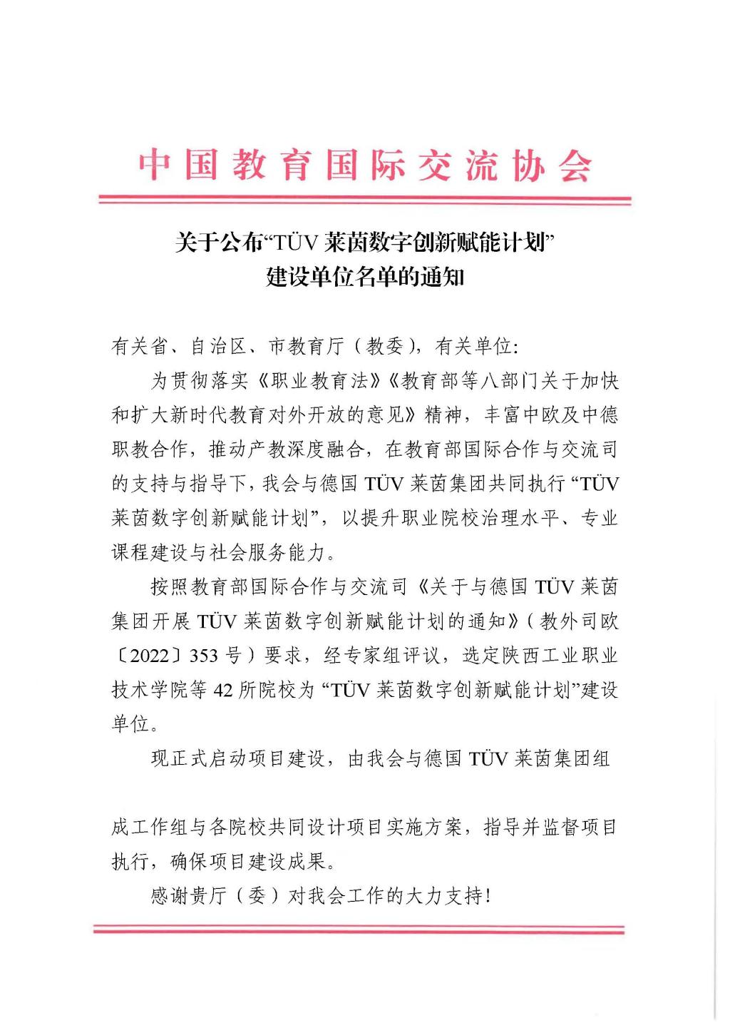 为丰富中欧及中德职教合作,推动产教深度融合,在教育部国际合作与交流司的支持与指导下,中国教育国际交流协会与德国TÜV莱茵集团共同执行“TÜV莱茵数字创新赋能计划”,以提升职业院校治理水平、专业课程建设与社会服务能力。此次,全国共有42所学校入选建设单位。