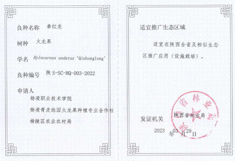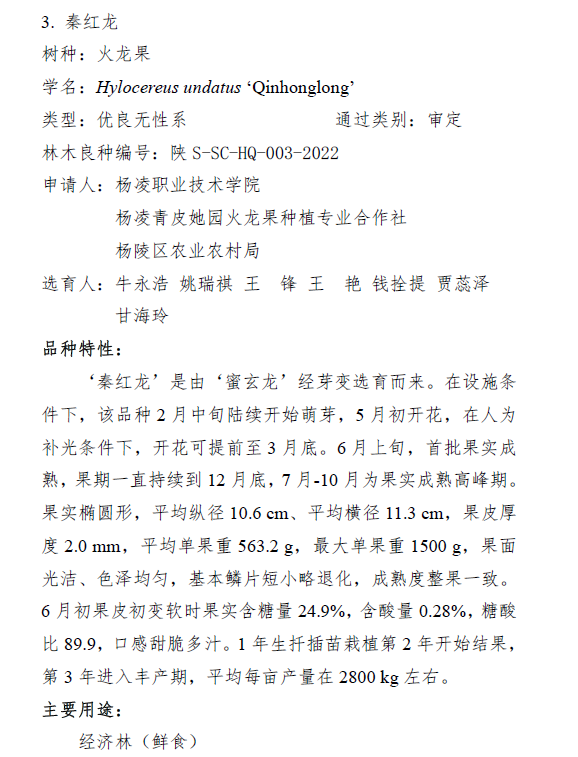 3月29日,陕西省林业局发布了2022年度陕西省林木良种名录,经陕西省林木和草品种审定委员会审定,全省共有29个品种为省级林木良种。由game365游戏中心官网火龙果产业研发中心牛永浩博士团队选育的火龙果新品种“秦红龙”通过审定。