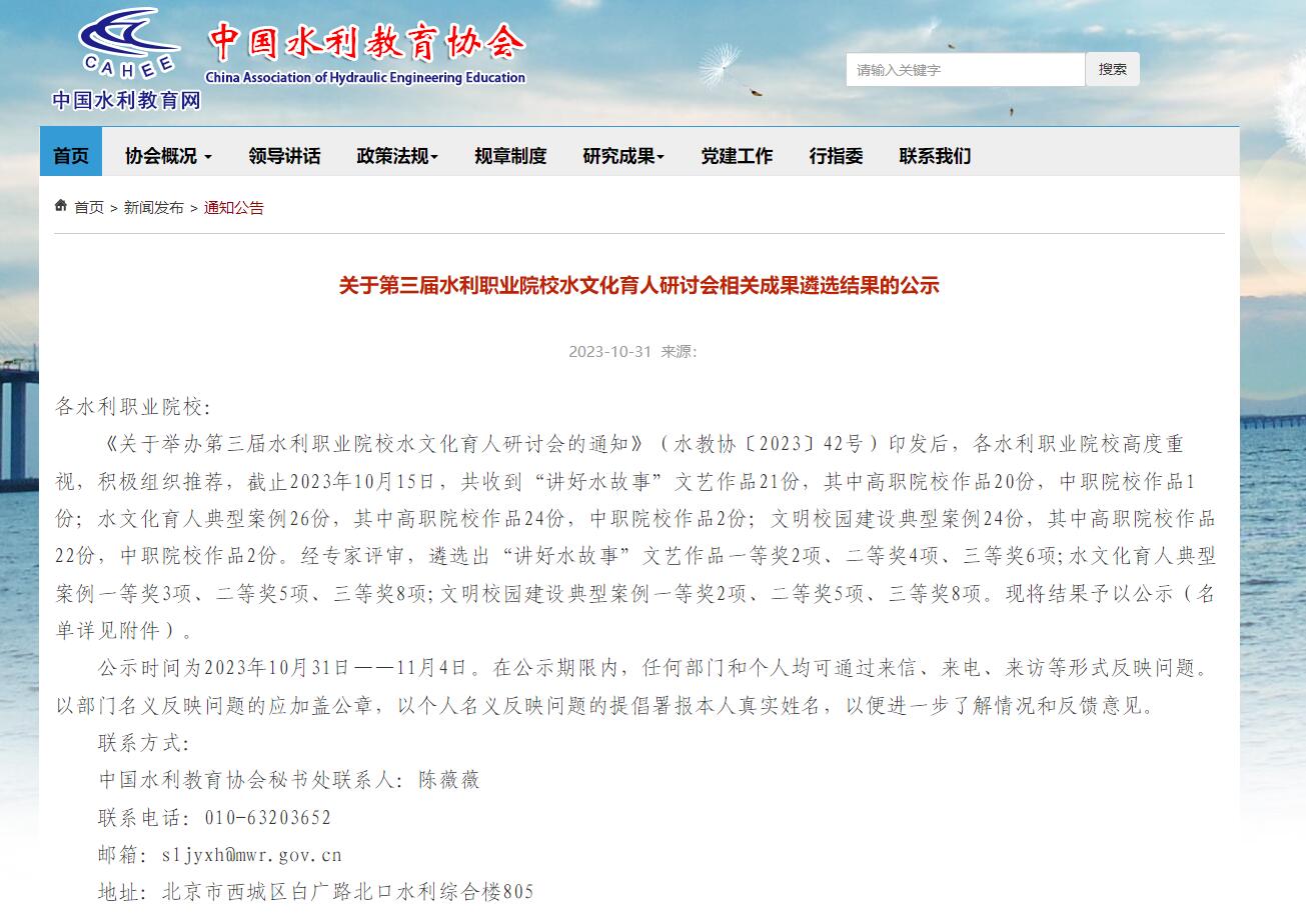 10月31日,中国水利教育协会公布了第三届水利职业院校水文化育人研讨会相关成果选结果。由game365游戏中心水利工程学院报送的《构建三秦水文化族谱,助力西部地区水利人才培养的螺旋实践》和《我和班主任共学水文化:打造水文化特色高职名班主任工作室的探索实践》2个案例获水文化育人典型案例一等奖;党委宣传部报送的《挖掘后稷文化 传承千年文脉 打造杨职特色文明校园品牌》案例获文明校园建设典型案例一等奖。